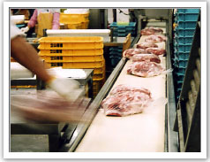 枝肉冷蔵庫から食肉加工室に搬入し、まえ、ロイン、まえばら、ももに大分割します。脱骨/解体/脂成形は